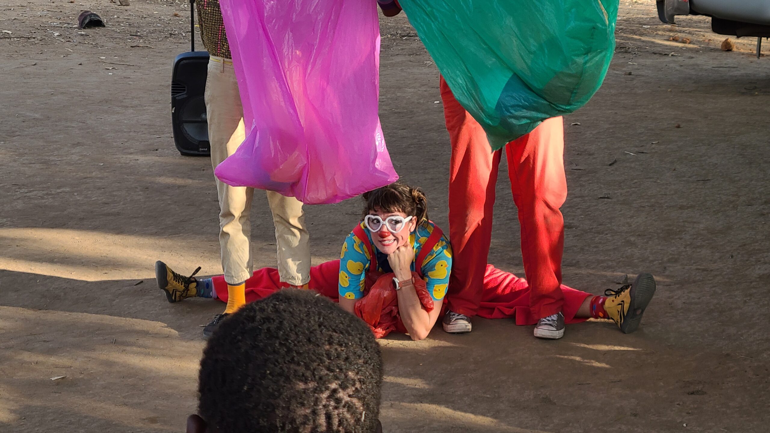Performing for audiences as large as 1,800 people, we made use of expansive outdoor spaces, gathering crowds in open fields where laughter rippled across the circle. These performances offered moments of shared joy, resilience, and human connection—reminders that even in the face of hardship, play and presence can build bridges and restore hope.